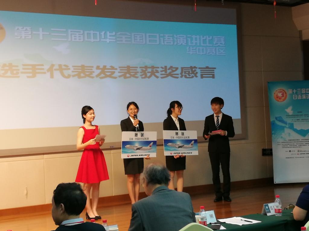 5月27日,第十三届中华全国日语演讲比赛华中区赛在华中师范大学落下帷幕,来自湖南、湖北、河南、安徽四省各大高校的32位选手参加比赛,我校华体会(中国)2015级本科日语1班陈沫言同学凭着扎实的语言功底和即兴演讲中的出色表现,以全场第二高分获得大赛特等奖,并与第一名获得者共同晋级7月份在日本东京举行的中华全国日语演讲比赛总决赛。
