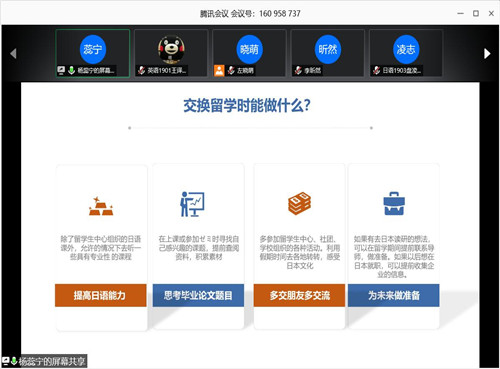 首先,杨蕊宁老师为同学们梳理了本科生日语专业留学的历史,解释了学校对于交换留学生的具体要求,并根据自身的经验向同学提出了在交换留学时的建议,比如:努力提高日语能力,借助交换优势构思毕业论文,多参加学生活动,深入感受日本文化以及收集信息,为未来的日本读研或就职提前做准备等。