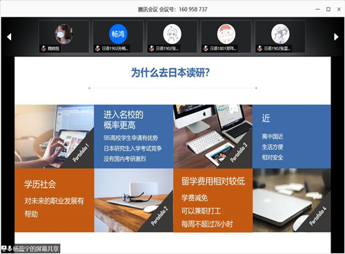 随后,老师从社会背景,录取概率,学费学情以及地理位置等方面为同学们介绍了在日本攻读研究生的优势,并且在是否借助留学中介这一问题上向同学们针对性地提出了建议。之后老师为同学提供了几个本科毕业论文研究方向和选择导师的小技巧,并提出了在申请学校的各个步骤中需要注意的一些问题。