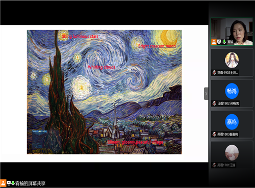 紧接着,老师通过具体分析梵高的代表作品之一——《星空》,使同学们对梵高的构图,视觉语言和象征性绘画语言有了更加深入的了解。画中以树木衬托天空,下部的房舍托起了无边的宇宙,这结构与普通人的认知完全相反。天上的星星像旋涡一样,具有线条美和律动感。屋舍好像被模糊了位置,模糊了光线,鲜明的对比透露出远离人群的哀伤。而最令人不可思议的是梵高运用了语言中的隐喻手法,及象征性绘画语言,用图画中的柏树来解释天与地,人与自然,生与死的关系。老师的讲解字字珠玑,为同学们打开了一扇了解梵高思想的大门,也向同学们展示了一座了解绘画与语言关系的阶梯。