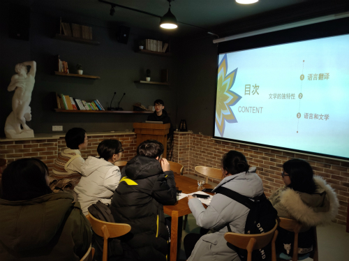 肖轶群同学主要从语言翻译、文学的独特性以及语言和文学三个方面为同学们解释了阅读文学作品在语言学习方面的重要性。首先,肖轶群同学从语言翻译出发。肖轶群同学表示,语言学习主要是思维方式的培养,并且以自己曾经翻译的经历为例,说明了翻译主要需要完整性思维,“较长的短期记忆”和连贯性思维。随后,他提出了自己对文学独特性的看法并且建议同学们进行阶段性阅读。肖轶群同学以自己的经验为例,为不同年级的学生提供了不同的阅读资料。鉴于此次的听众大部分为大一的新生,他建议刚接触日语的新生们可以先从轻小说开始阅读。除此之外,他还总结了阅读文学作品的两个主要作用。从具体的作用来说,文学作品具有模仿价值,同学们可以选择跟读轻小说;从抽象的作用来说,文学所具有的延展性使同学们可以通过阅读了解更多的日本文化。
