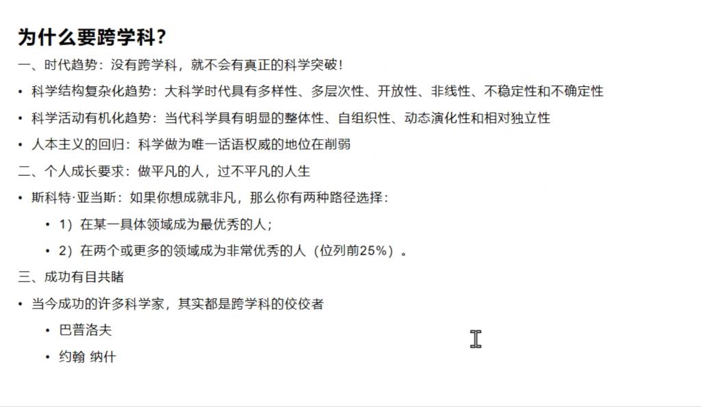 为什么要跨学科?时代趋势:没有跨学科,就不会有真正的科学突破。科学结构复杂化趋势:大科学时代具有多样性、多层次性、开放性、非线性、不稳定性和不确定性;科学活动有机化趋势:当代科学具有明显的整体性、自组织性、动态演化性和相对独立性;人本主义的回归:科学作为唯一话语权威的地位在削弱。个人成长的要求:做平凡的人,过不平凡的人生。正如斯科特·亚当斯所言:“如果你想成就非凡,那么你有两种路径选择。”,在某一具体领域成为最优秀的人。在两个或更多的领域成为非常优秀的人(位列前25%)。