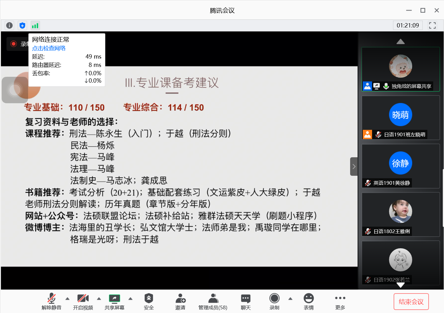 第三部分主要为同学们介绍了公共课以及法硕专业课备考的注意事项。首先是政治,关于政治不同的题目要选择不同的试卷来进行练习,强调在不同阶段和时间要有不同的练习侧重点。并且一定要注重选择题,选择题是政治考试的关键。学姐还为同学们介绍了复习资料和老师的选择,给同学们推荐了徐涛、肖秀荣和陆寓丰老师以及相关的复习资料。然后是英语,学姐根据不同的题型为大家推荐了不同的学习资料和APP,还为同学们介绍了答题的小技巧,首先单词和阅读是最重要的,答题时要有侧重点。然后答题时要注意答题的顺序,按照作文-阅读-其他的顺序作答。最后是专业课备考建议。学姐根据自身经历,主要为同学们介绍了法硕备考的复习资料与老师的选择,包括课程推荐、书籍推荐、网站、公众号、微博博主等。然后提出了关于法硕备考的背诵建议,一定要注意分析,学会分析考点和知识点,多改多积累。
