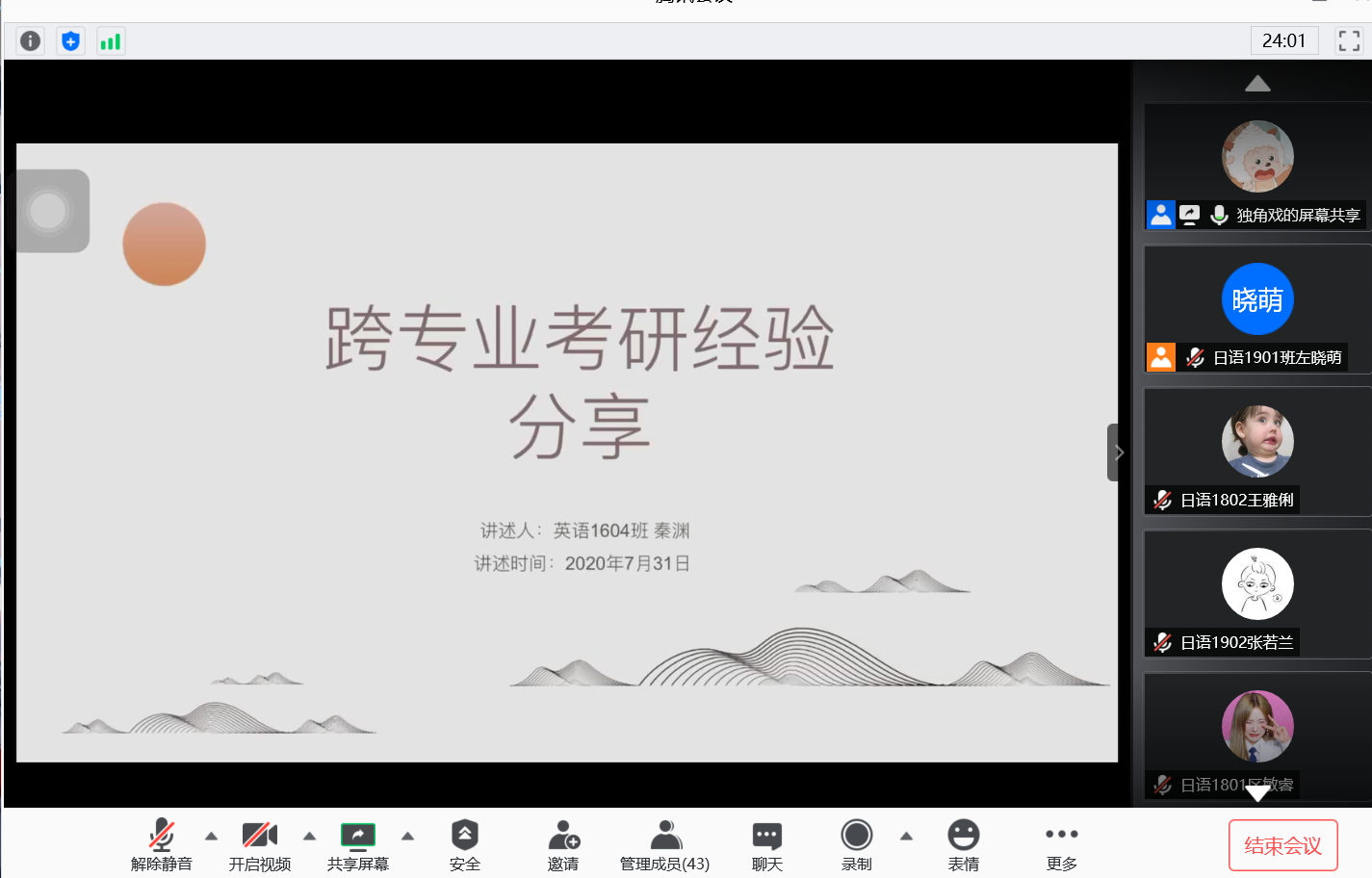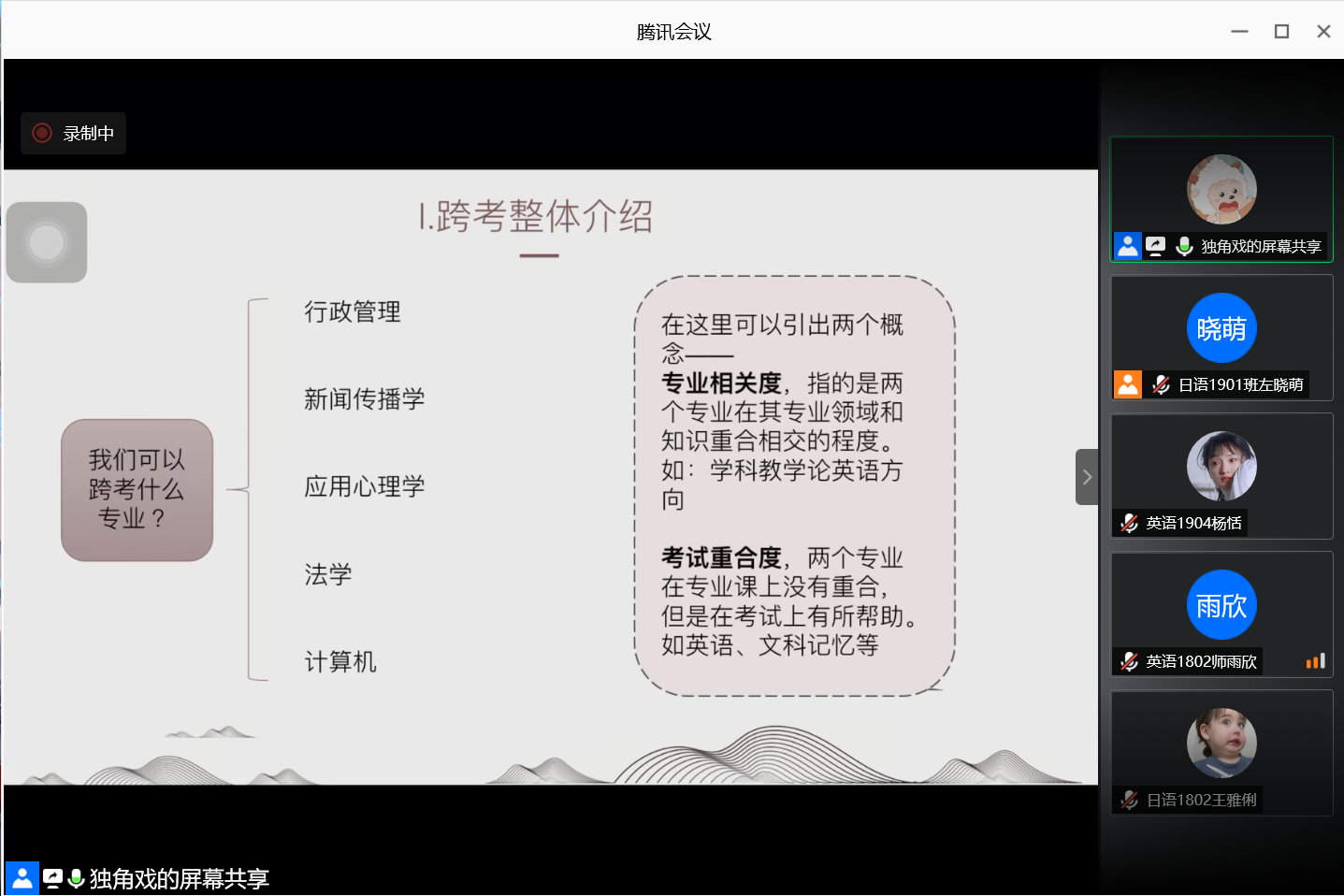 本学期第二讲(总第十八讲)“与君说”于07月31日在腾讯会议举行,报名人数51人,到场人数56人。主讲人为秦渊学姐,主题为“跨专业考研”。
