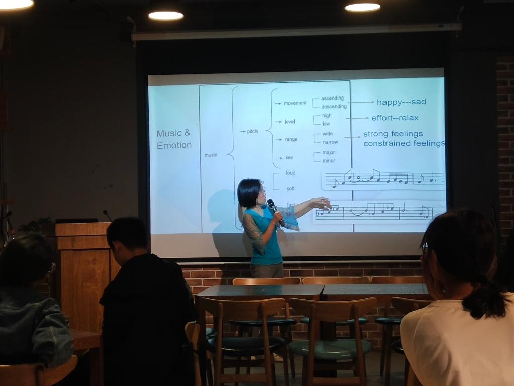 于老师以Baby及Let Her Go两首歌为案例,截取其中的典型片段与同学们共同运用上述知识具体地进行了分析。于海玲老师还特别提及了个人经历等感性方面对歌曲所传达的情绪及意义的影响。
