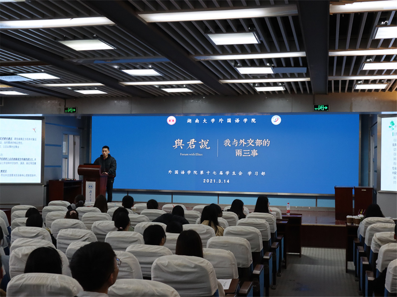 华体会(中国)2020-2021学年度春季学期第一讲“与君说”课程于3月14日14时30分于华体会(中国)学术报告厅顺利举办。本次课程以“我与外交部的两三事”为主题,旨在增进同学们对“外交部定向培养人才”选拔过程的了解,并为同学们提出具体可行的备考建议。