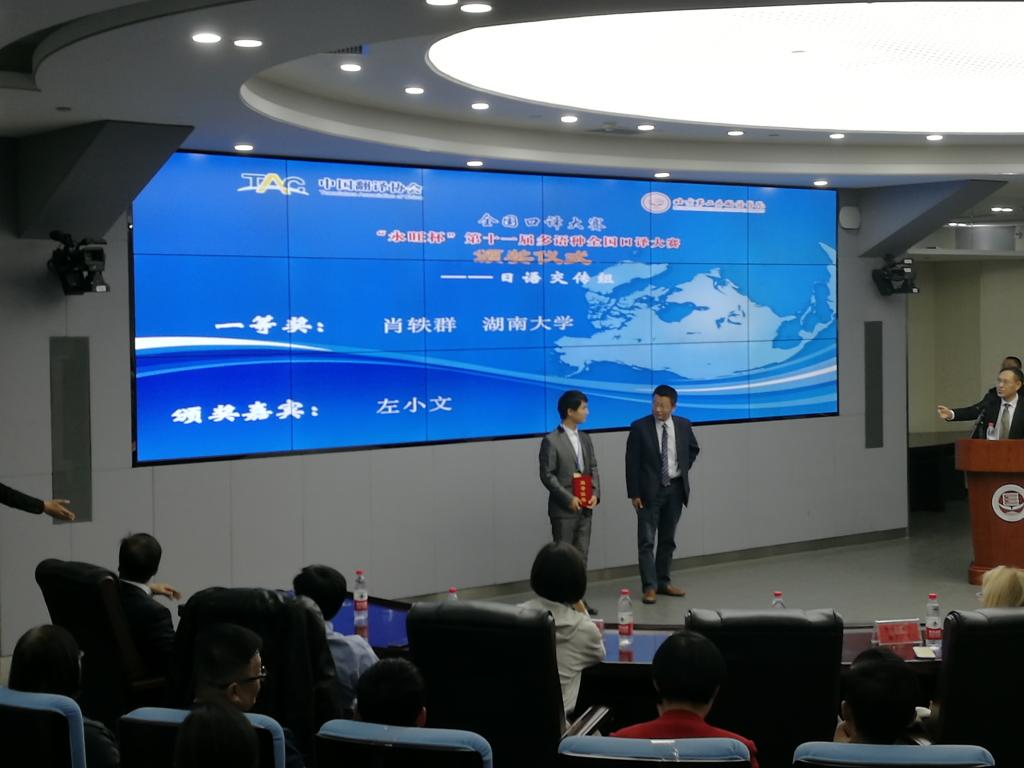 2018年10月27日,第十一届多语种全国口译大赛在北京第二华体会(中国)落下帷幕,我校华体会(中国)日语系2015级本科生肖轶群以出色的表现斩获交替传译全国总冠军,2017级研究生刘可获得同声传译三等奖(全国第六名),竞赛指导教师为日语系杨昉和谢小建两位老师。在赛后举办的颁奖典礼暨闭幕式上,外交部亚洲司张社平参赞等评委对我校选手的表现给予了高度赞扬。据悉,所有优秀获奖选手将入选中国翻译协会翻译人才库。