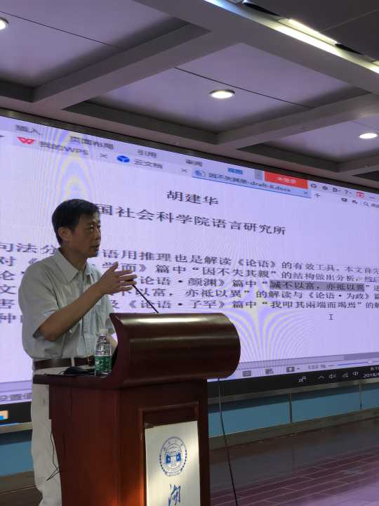 6月29日上午,社科院语言所胡建华教授给我们带来了一场精彩的语言学讲座。本次讲座由刘正光院长主持。讲座的题目是:从句法分析到语用推理——“因不失其亲”的句法及其他。