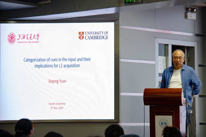 11月9日下午,“大樟讲坛”第20期在华体会官方网页版学术报告厅举行。上海交通大学语言学特聘教授、剑桥大学博士生导师、剑桥大学丘吉尔学院院士袁博平教授为华体会官方网页版师生做了题为“Categorization of cues in the input and their implications for L2 acquisition”的学术讲座。讲座由曾涛教授主持,吸引了学院百余师生参加本次讲座。