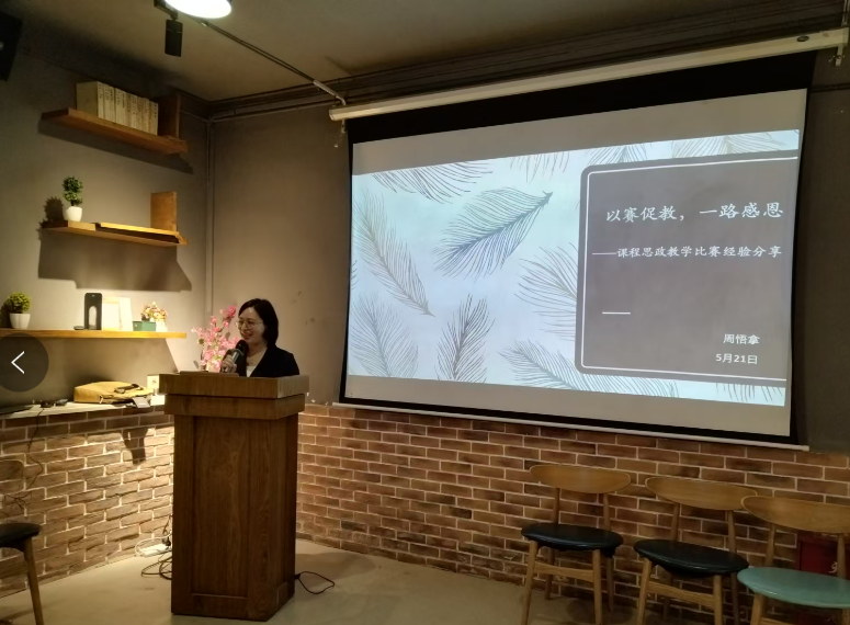 周悟拿副教授做了题为《以赛促教,一路感恩》的经验分享。她从自己去年一年高强度三次参加课程思政比赛的切身经历出发,分享了从复赛到决赛的遇到的困难与应对的策略,以及通过参加比赛自己在教学方面的巨大收获。莫婷副教授以《深度挖掘、有机融合、无声润物—探索大学英语课程思政教学之路》为题向与会的各位老师着分享了如何切实从教材文本出发构建教学思路与结构,寻找思政切入点,将课程思政与教学有机结合。