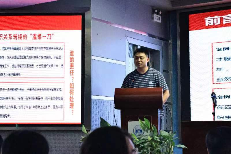 会议第一项,由辅导员范浩坡讲解毕业生党组织关系转接相关事项。范浩坡老师通过两个党组织关系转接失败的案例,强调了毕业生党组织关系转接的重要性。他详细介绍了系统内与系统外两种组织关系转接的形式,并对转接方向和接转程序进行了详细说明,还提供了组织介绍信的模板供各位党员参考。