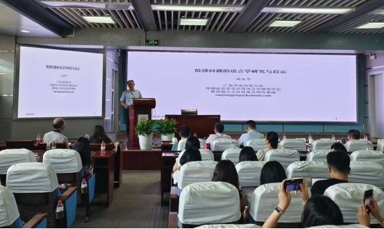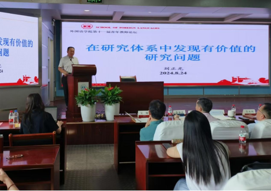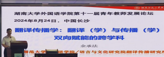 会议第一天为学术讲座与座谈。刘正光、冉永平、胡强、余承法、贺川生等5位教授作大会主旨报告。学院刘正光教授以“在研究体系中发现有价值的研究问题”为题,结合自身的科研经验,分享了科学研究三要素的关系、研究体系可能内涵、在体系中发现问题、研究体系的向外辐射等四个问题。《现代外语》主编、广东外语外贸大学冉永平教授以“情感问题的语言学研究与启示”为题,从学科中出现的新趋势、新特征出发,探讨了语言学研究、二语教学与学习中的情感问题研究现状。湘潭大学研究生院院长胡强教授以“问题与意识——学科图谱与教师的‘学科建设’”为题,分析了高等教育和外国语言文学学科发展的新形势,以及如何在新形势下谋求新发展。湖南师范大学余承法教授以“翻译传播学:翻译(学)与传播(学)双向赋能的跨学科”为题,对翻译传播学的主要研究内容、翻译(学)与传播(学)的双向赋能、翻译传播学“四位一体”研究等内容进行了阐述。学院贺川生教授以“从古代文献和早期语法书中挖掘素材:以数词为例”为题,阐述了对世界不同语种的历史文献中记载的原始计数法进行研究的方法和结论。交流座谈环节,青年教师、研究生们踊跃提问,就研究方向、研究选题、研究方法等问题,积极向专家们“取经”。