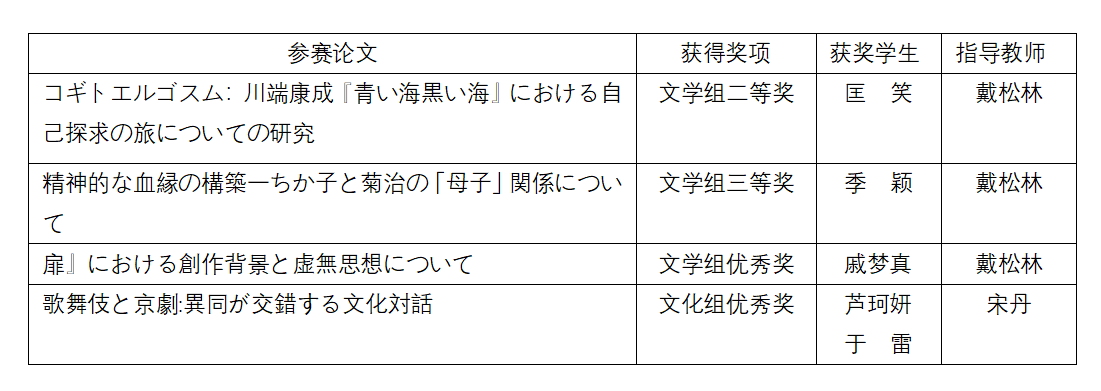 此次比赛共有来自全国52所参赛校、共计201篇论文参与角逐。经过初赛的严格筛选和决赛的现场答辩,我校日语专业学生与来自北京大学、中国人民大学等各高校的选手同台竞技,载誉而归。其中,文学组荣获二等奖、三等奖及优秀奖各1项;在文化组获优秀奖1项。指导教师荣获优秀论文指导教师奖。