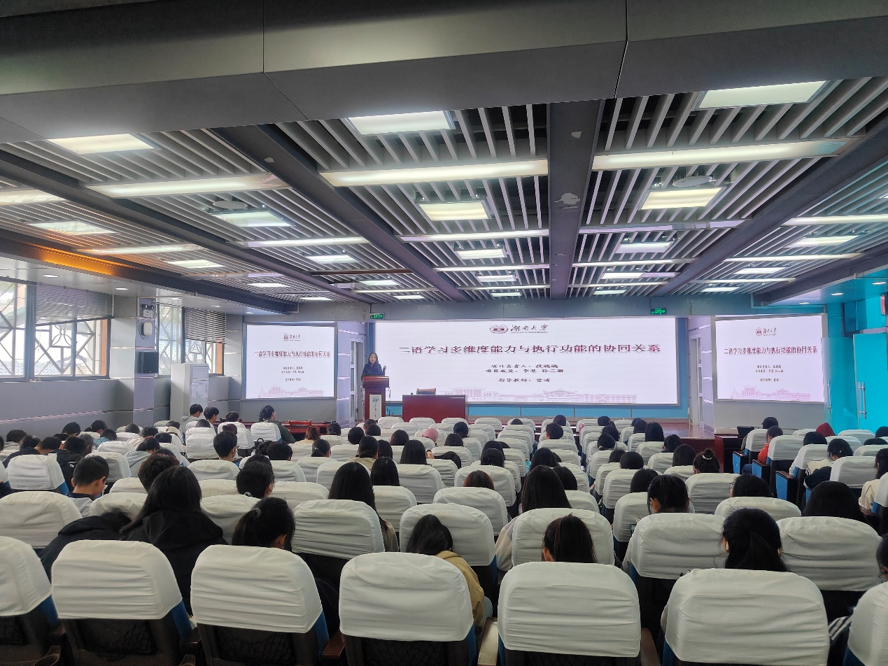 段鹃鹃同学分享了其在本科期间主持的项目——二语学习多维度能力与执行功能的协同关系。她从研究背景及目的,研究问题,研究对象,研究方法和结论几个角度对项目内容,进行了分享。