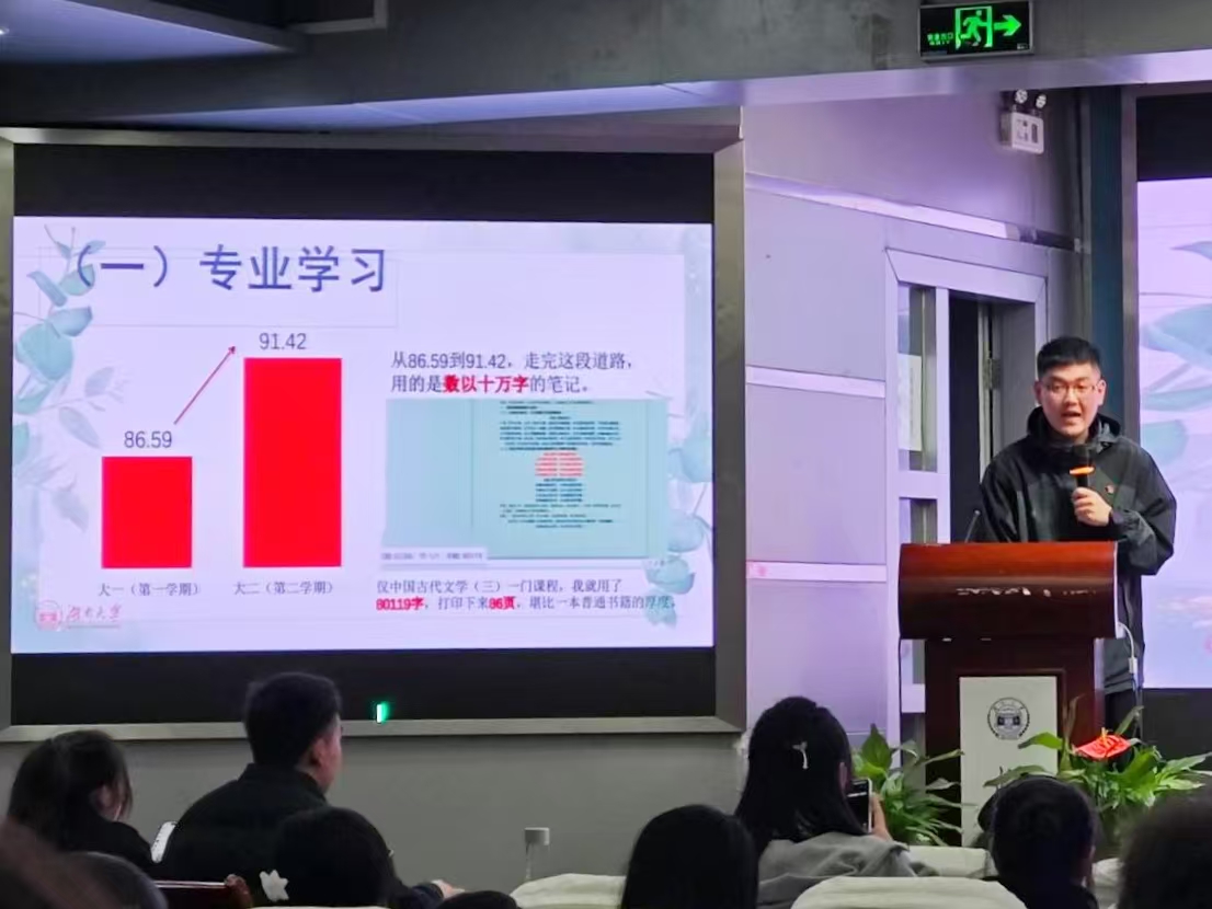 胡淏然从专业学习、比赛竞赛、志愿实践、学生工作、党务工作等几个维度进行了分享。强调了专业学习的重要性,以文科学生关键的学习环节--如何背诵为开篇,详细分享了自己对专业学习方法的深刻理解,以及在学习过程中的实践经验,并分享了如何强化对知识的理解和深入的方法。胡淏然提出同学们要明确项目工作量,重视资料的搜集,力求创新,避免与前人的研究重复,鼓励同学们积极与其他专业的同学展开交流、共同进步。在学生工作方面,胡淏然介绍了担任军训教官和及新生助理的经历,鼓励同学们踊跃参与各类学生工作与志愿实践活动,拓宽自身的视野和阅历。