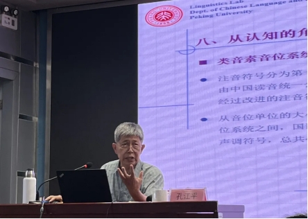 讲座伊始,孔教授介绍了当前研究的学科背景以及语音的研究发展历史,并指出传统的语音学和音位学存在一定的问题,需要进行革新。随后,孔教授基于生理模型和建模,从时间和空间两个维度详细地介绍了人类的发音机制的演化和语音认知的特点,为语音学和音位学的研究提供了生理学基础。孔教授接着通过音位单位、区别性特征和语音意识等概念,向老师和同学们详细地介绍了认知音位的详细单位和基础。在此基础上,孔教授进一步介绍了音位负担量这一概念,并提出了音位认知的研究理论和方法,并以此深入探究了汉语音位系统的特点。
