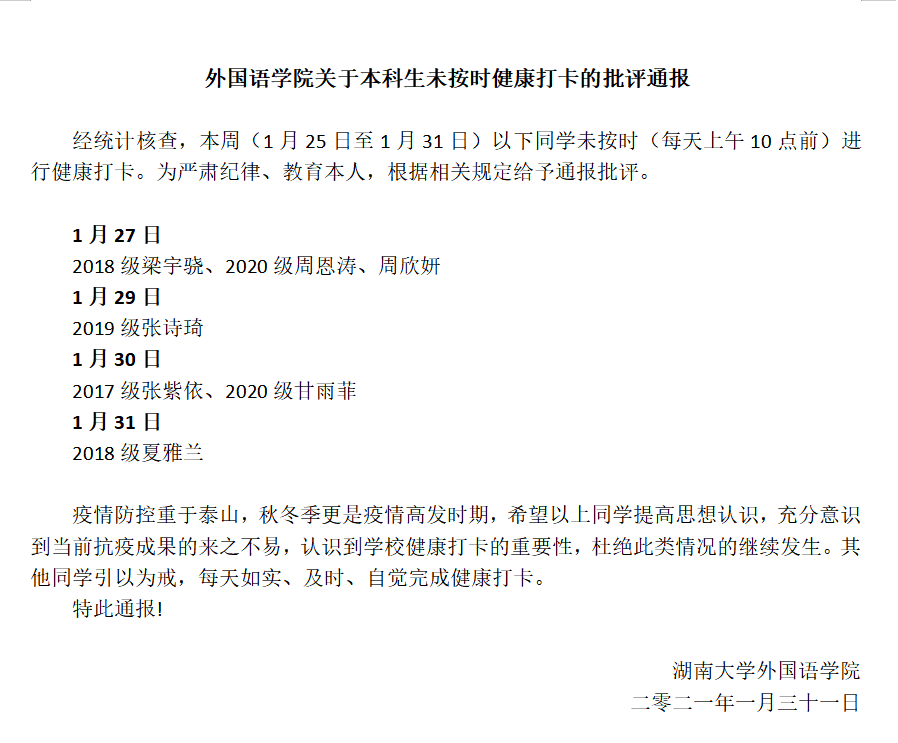 华体会(中国)关于本科生未按时健康打卡的通报批评