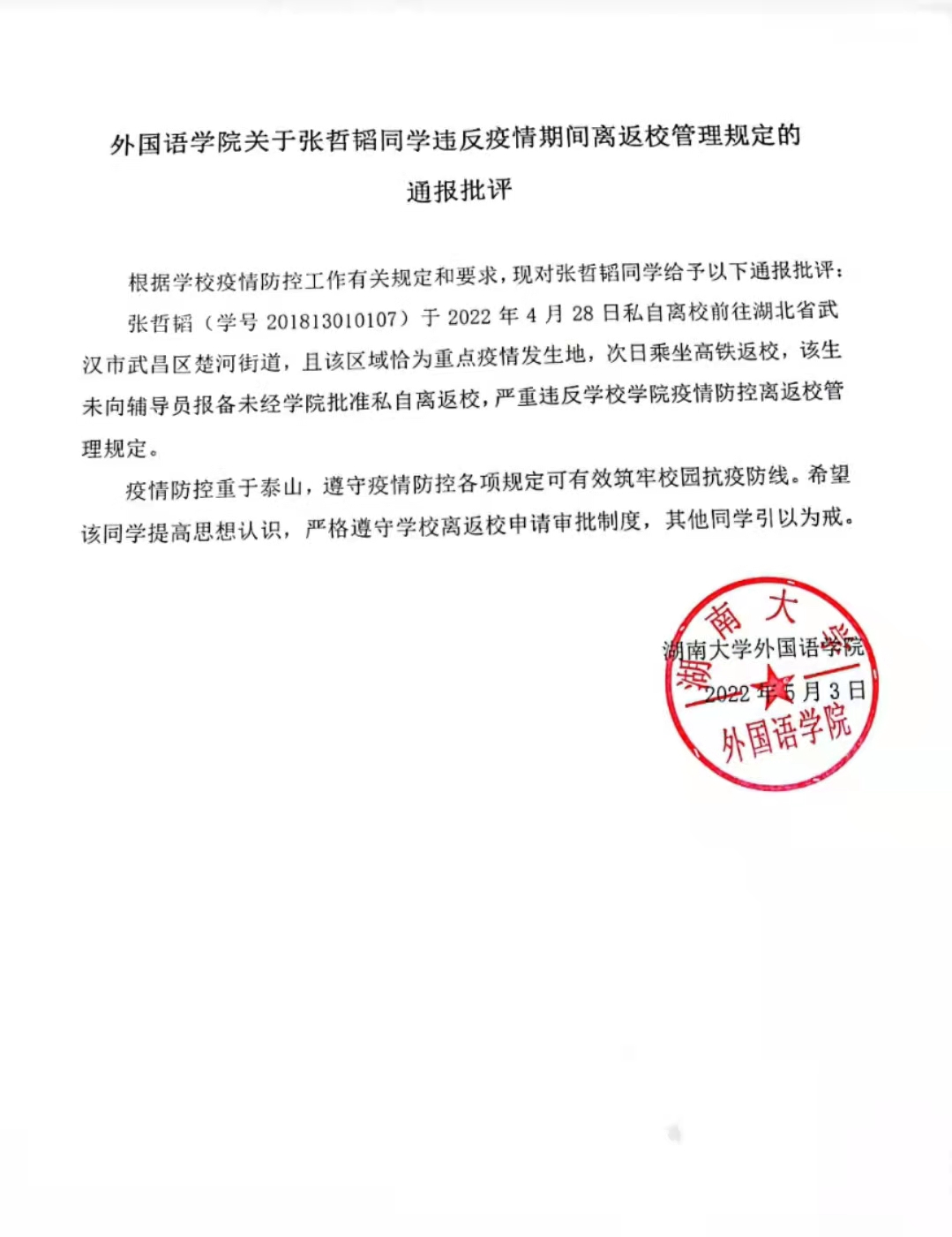 华体会(中国)关于张哲韬同学违反疫情期间离返校管理规定的通报批评