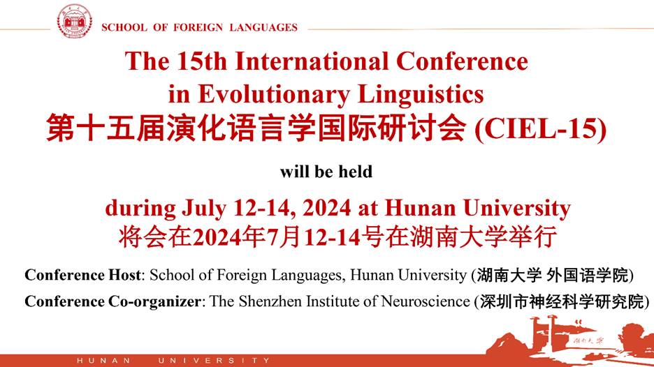 The 15th International Conference in Evolutionary Linguistics (CIEL-15) will be held during July 12-14, 2024 at Hunan University. CIEL-15 will be held by School of Foreign Languages, Hunan University, and co-organized by the Shenzhen Institute of Neuroscience.
